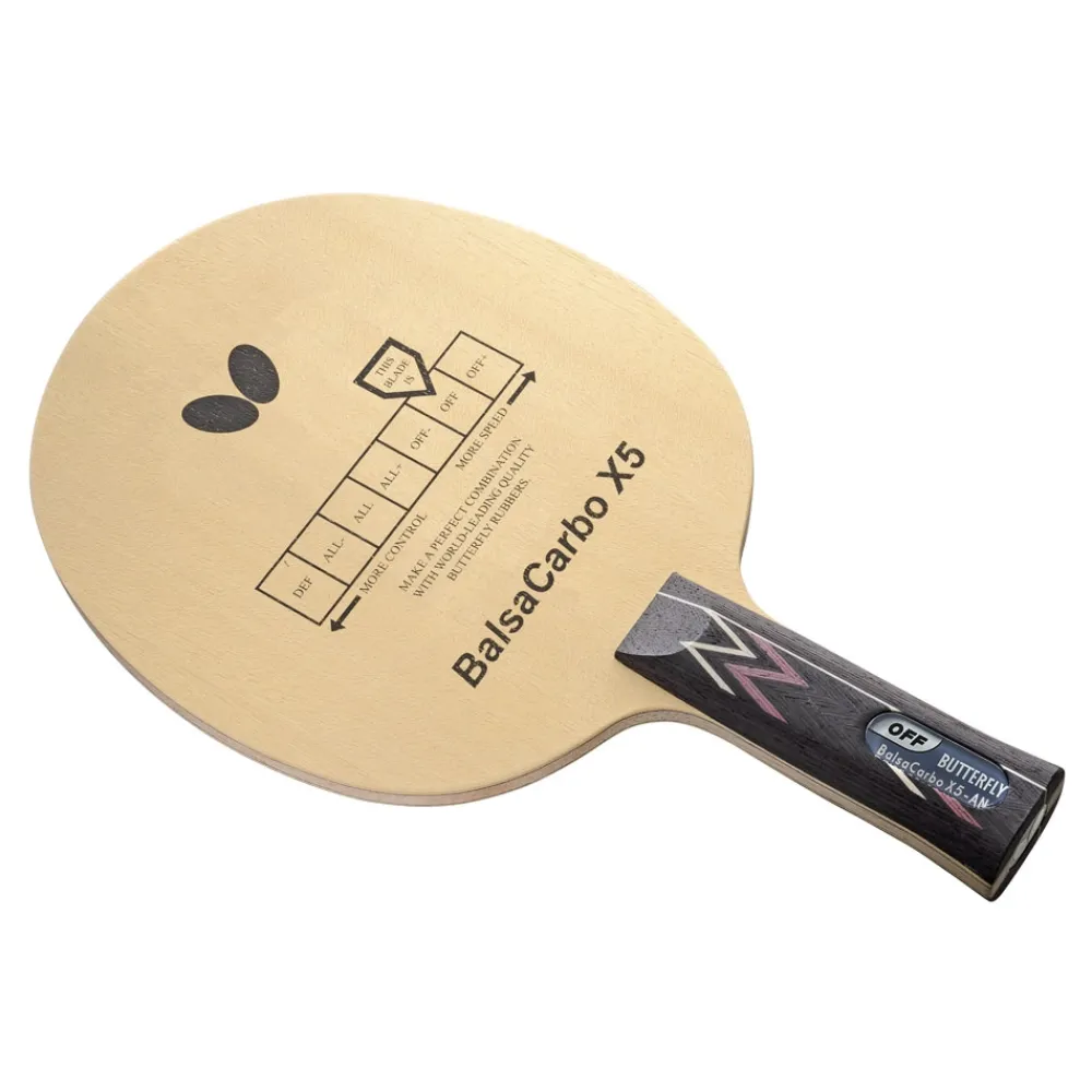 Ved at benytte en kerne af Balsatræ skabes det hurtige og utrolige touch af det berømte 3-lags BALSA CARBO X5, mens de to Carbon fibre giver stabilitet og præcision til dette offensive bat, bedst brugt til kontrollerede blokeringsskud kombineret med hurtige topspins.