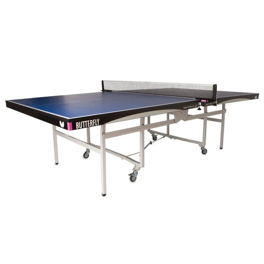 Bordet SPACE SAVER 22 er et af de mest populære i Butterfly serien. Det er velegnet til turneringer og klubturneringer. Med sin 22 mm højde og Perfect Grip spille overfladen er bordet er godt valg. Pladerne er beskyttet af et massivt stål flange med forstærkninger i hjørnerne. Ovenstående er støttet af en stål ramme, som har 4 hjul, hvoraf 2 har bremser. Benene giver mulighed for opvatring så du kan få et lige bord selvom gulvet er skævt. Transport og opbevaring er gjort let med foldesystem SPACE SAVER . helt enkelt og nemt. Sammenklappet bredde 56 cm.