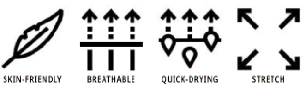 Egenskaber: Skåsom for hud, åndbar, quick dry & stræk